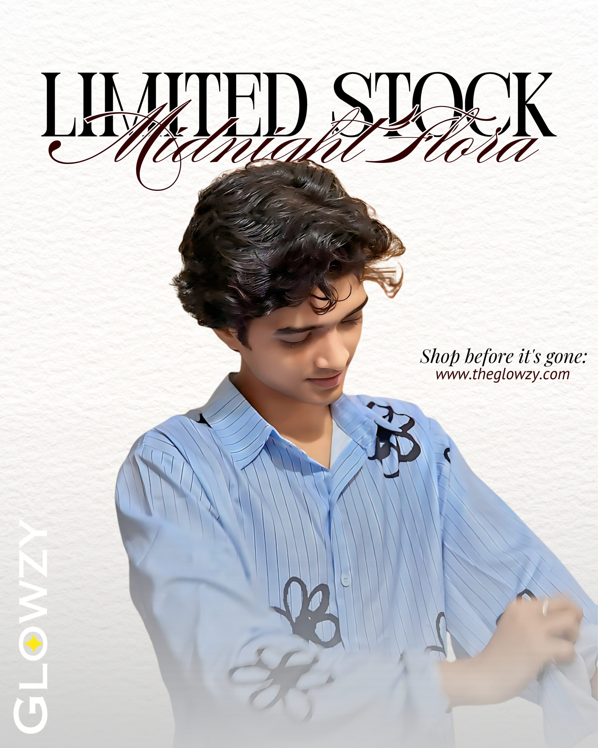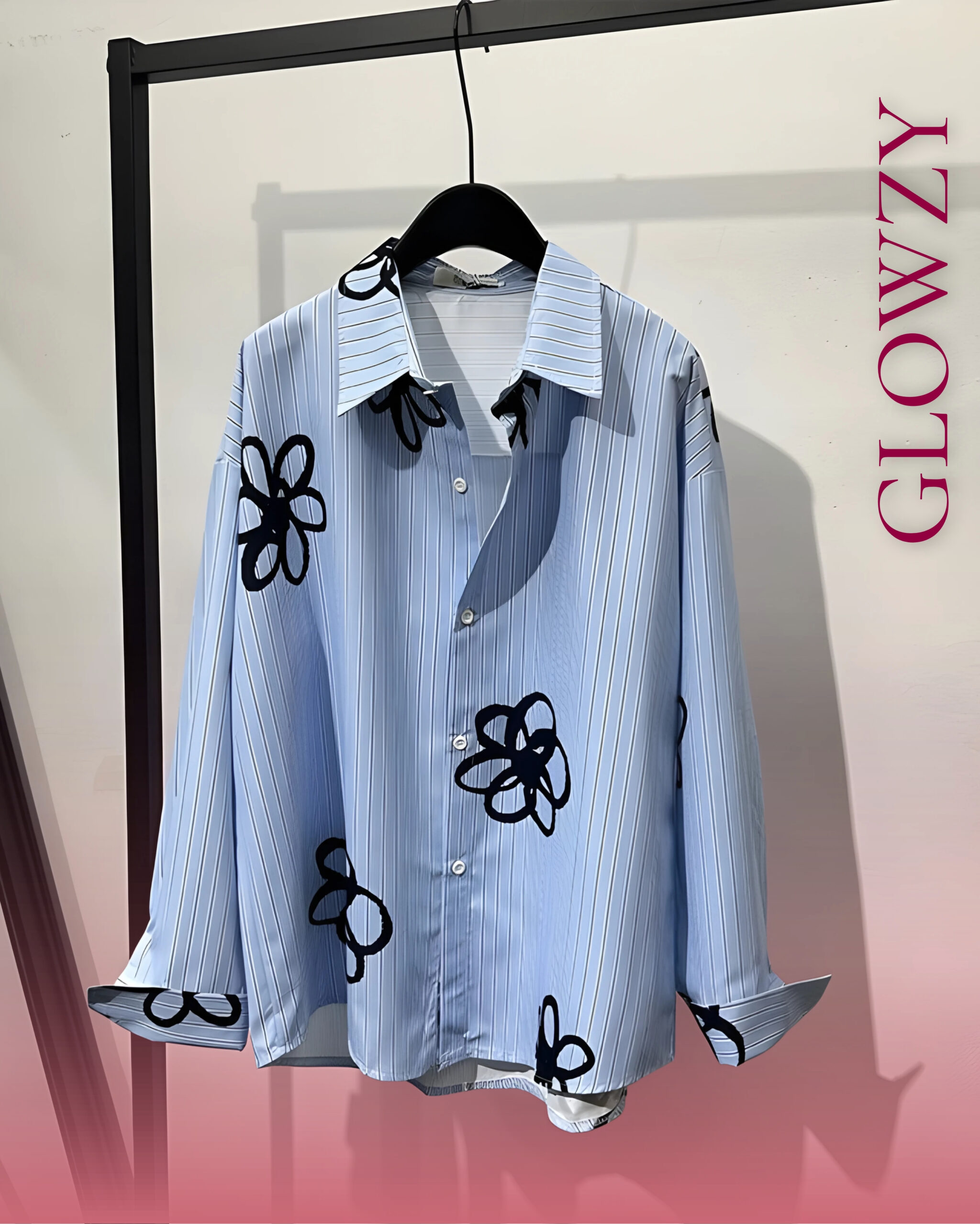 • Light blue striped base with bold black floral accents